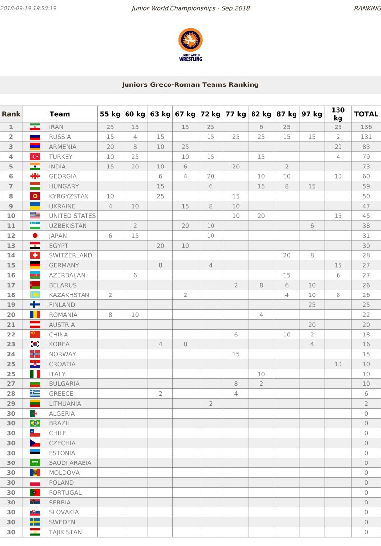 رده بندی تیمی: 1- ایران (136 امتیاز) 2- روسیه (131 امتیاز) 3- ارمنستان (83 امتیاز) 4- ترکیه (79 امتیاز) 5- هند (73 امتیاز) 6- گرجستان (60 امتیاز) 7- مجارستان (59 امتیاز) 8- قرقیزستان (50 امتیاز) 9- اوکراین (47 امتیاز) 10- آمریکا (45 امتیاز)
