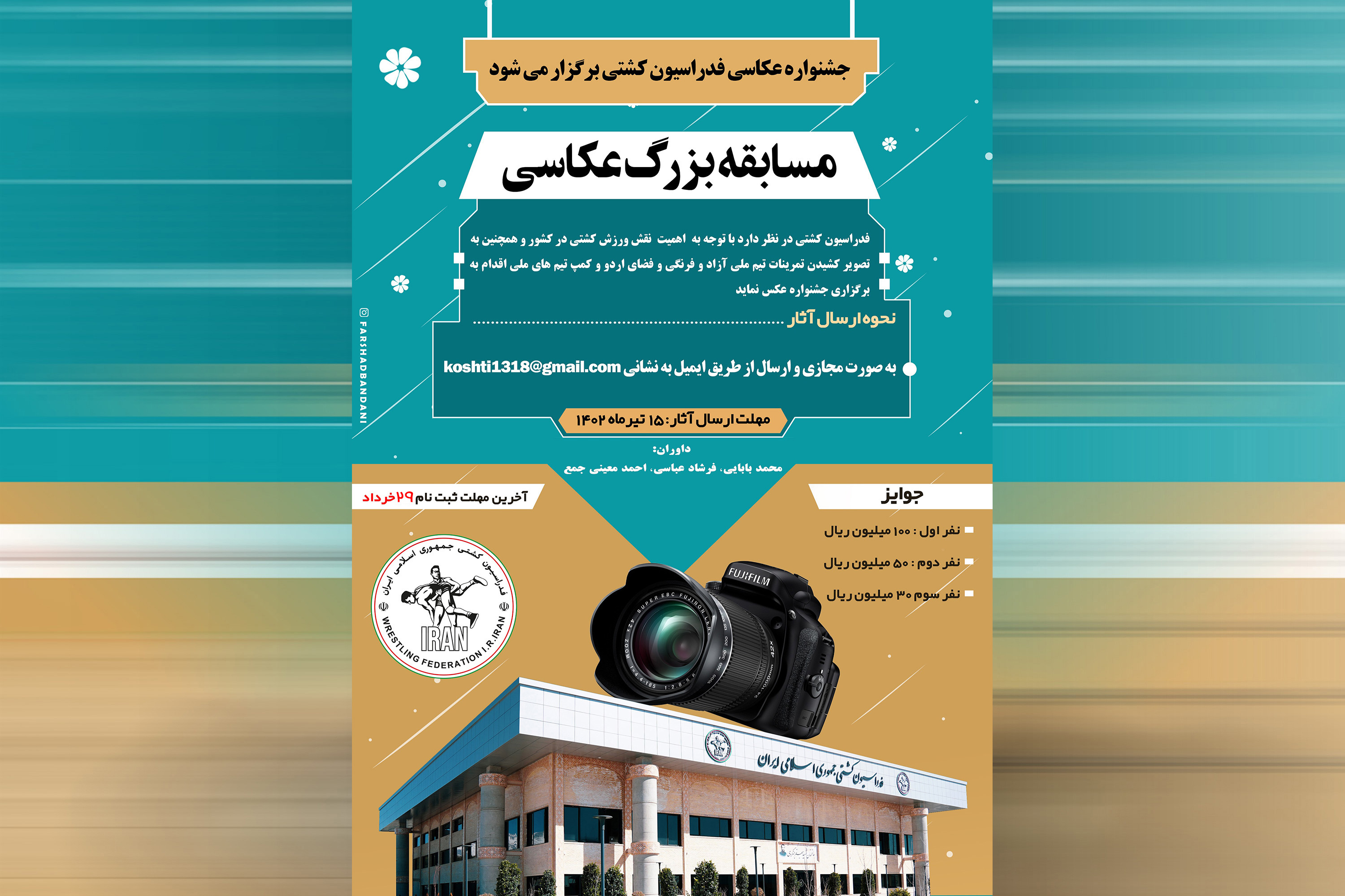 فدراسیون کشتی در نظر دارد با توجه به اهمیت نقش ورزش کشتی درکشور و همچنین به تصویر کشیدن تمرینات تیم ملی آزاد و فرنگی و فضای اردو و کمپ تیم های ملی اقدام به برگزاری جشنواره عکس نماید.