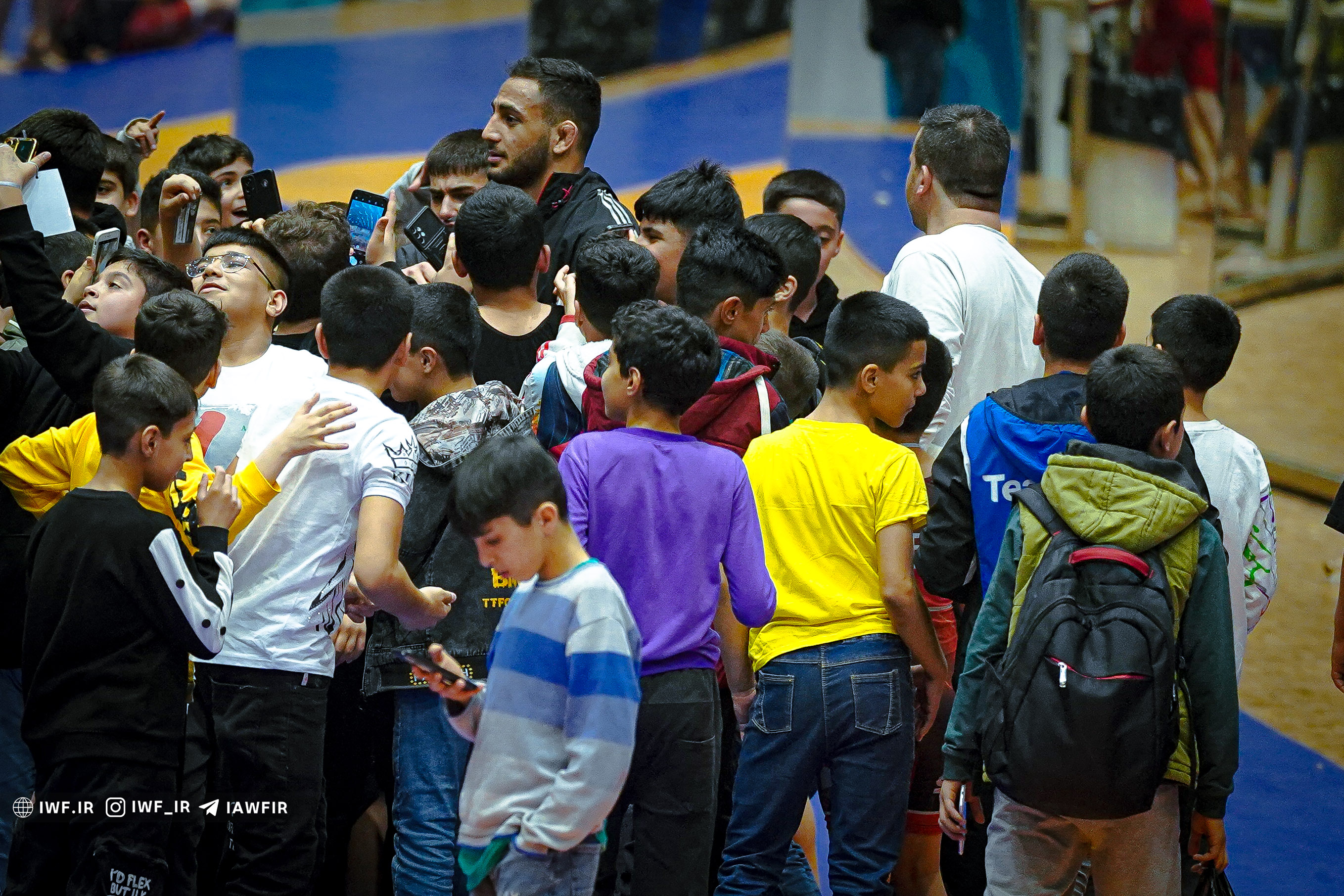 آینده سازان کشتی کشور که برای اولین بار فضای تمرینی قهرمانان کشتی المپیک و جهان را می دیدند به دنبال دیدن ملی پوشان کشتی کشورمان بودند و هیاهو و شور و شوق آن ها منجر شد تا کشتی گیران که پس از تمرینات سخت در حال استراحت بودند در میان آن ها حاضر شوند.