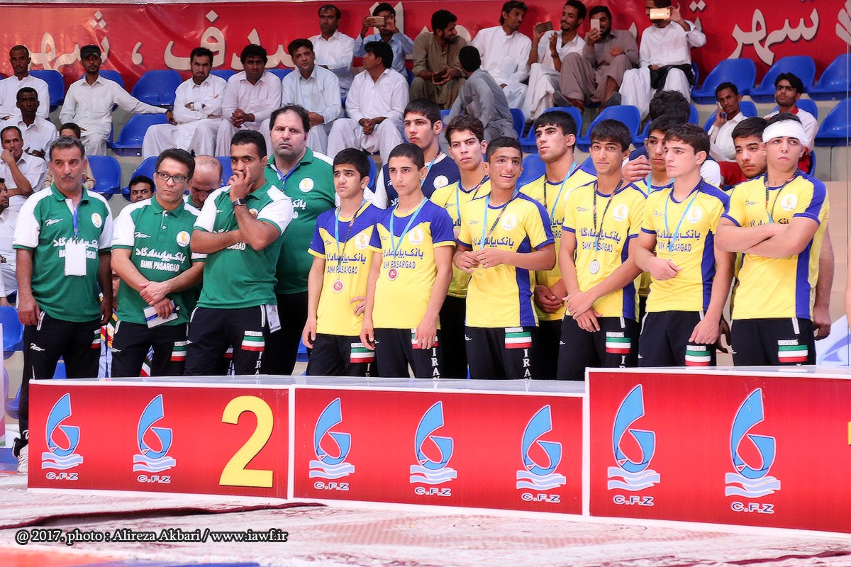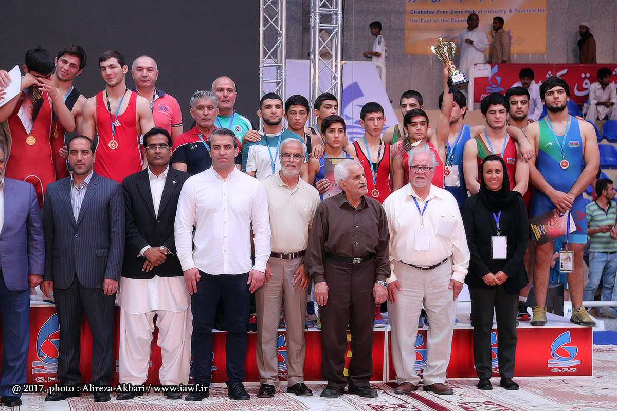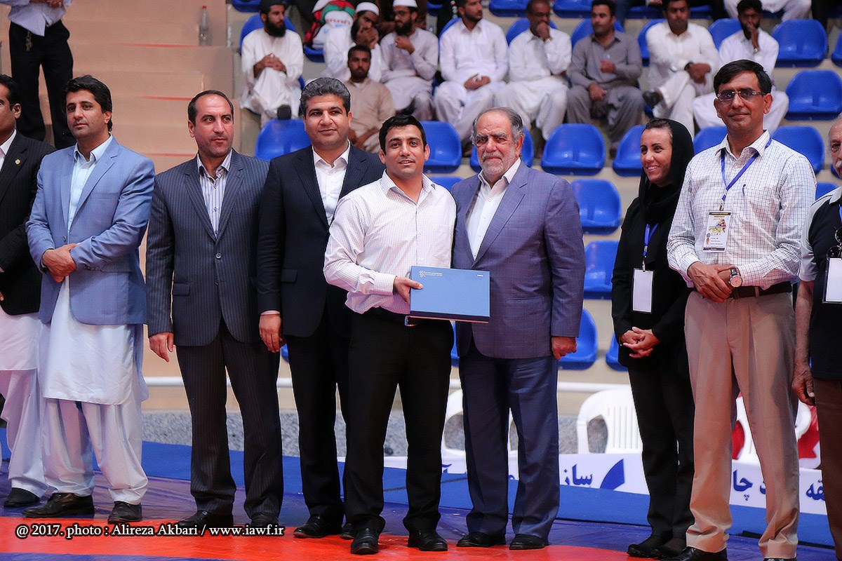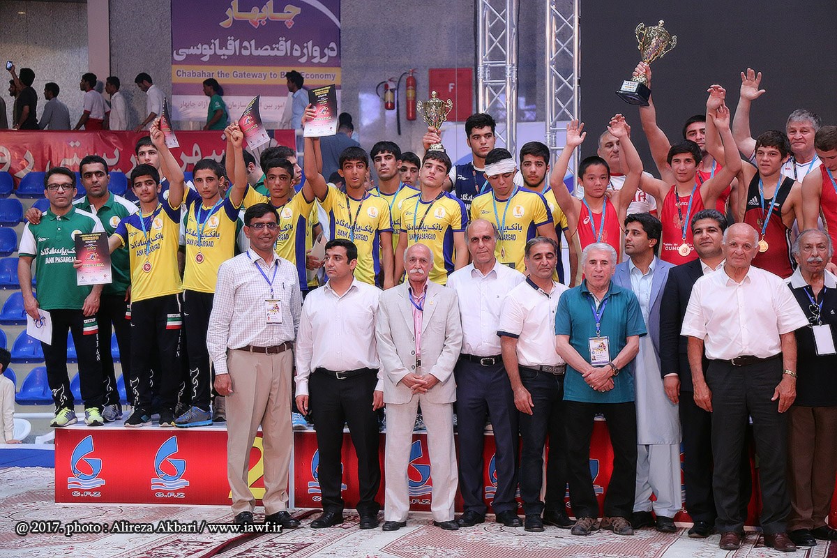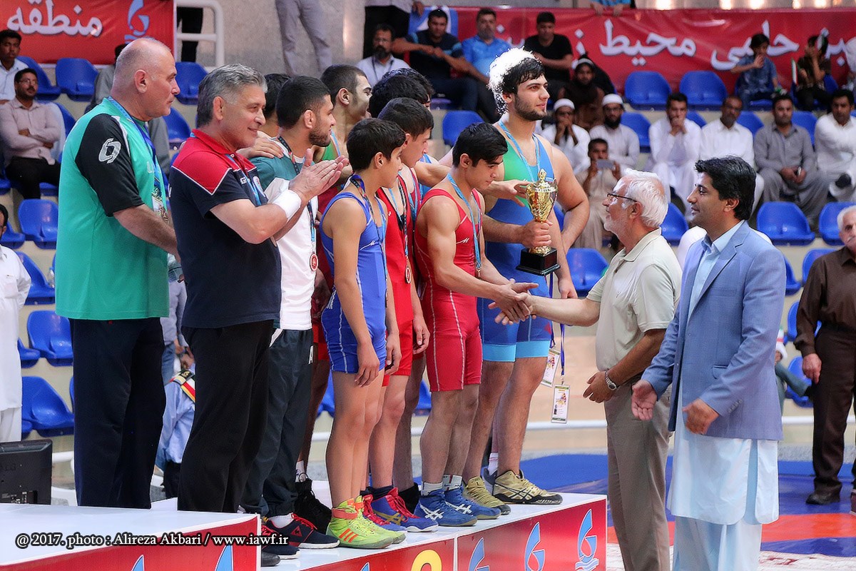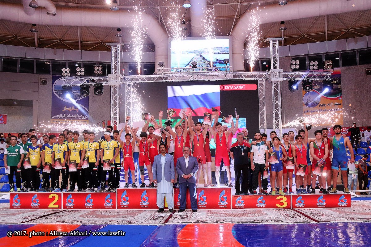 مراسم اهدای کاپ و مدال قهرمانی سومین دوره رقابت های بین المللی کشتی آزاد نوجوانان جام یادگار امام (ره) در سالن ورنا منطقه آزاد چابهار