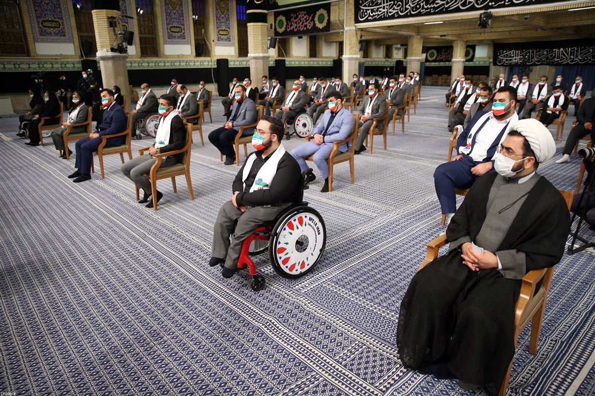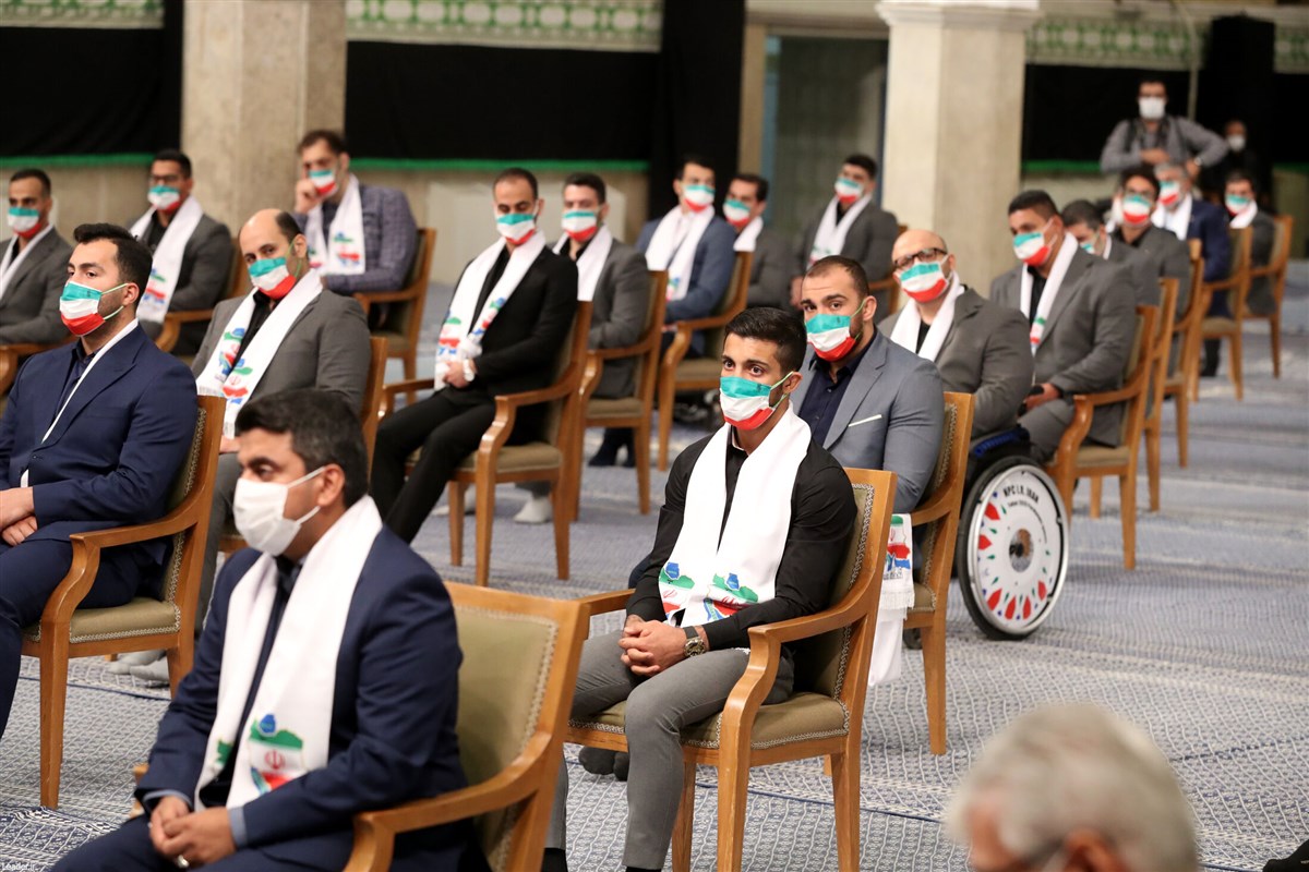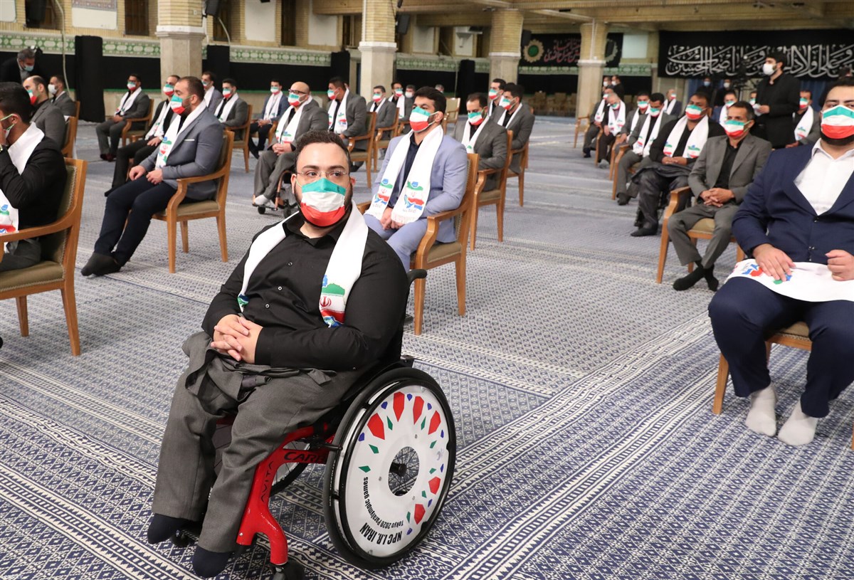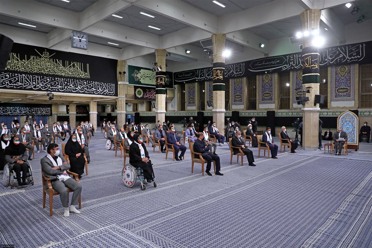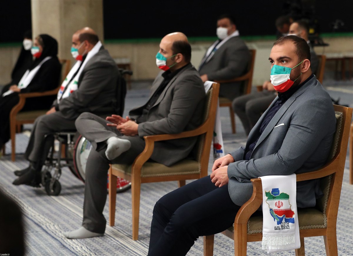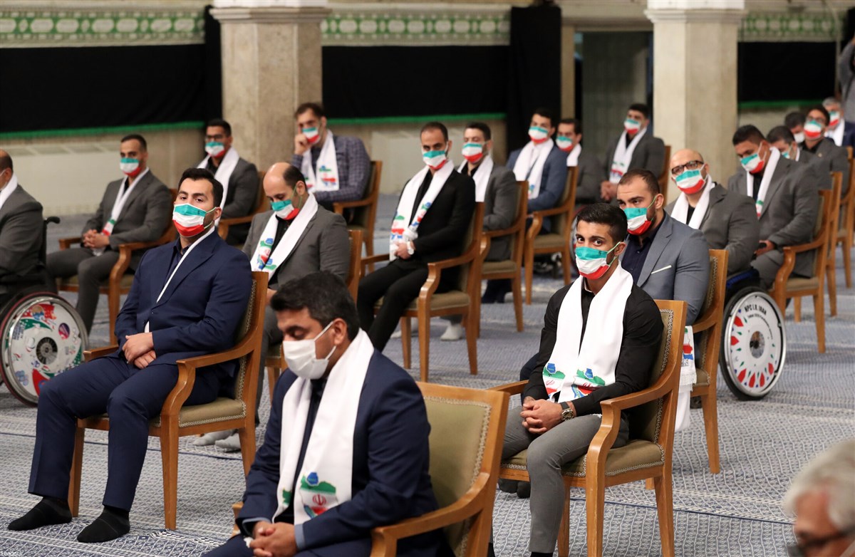 حضرت آیتالله خامنهای تجلی ارزشهای انسانی و دینی و معنوی در کنار قهرمانی را بسیار ارزشمند خواندند و با اشاره به نمونههایی از این موارد در رقابتهای المپیک و پارالمپیک گفتند: نامگذاری کاروان ورزشی به نام شهیدان بویژه شهید سلیمانی، اهدای مدال از طرف چند قهرمان به شهیدان خاص، استفاده از چفیه بهعنوان نماد ایثار و مقاومت و سجده برآن، رعایت حجاب و پوشش بخصوص استفاده از چادر در پرچمداری کاروان، ابراز عشق و محبت به پرچم ایران، صحنه های نماز خواندن، درآغوش گرفتن حریف مغلوب و صحنه احترام تیم والیبال پارالمپیک به مادر شهید بابایی، جلوههایی از ارزشهای اسلامی و معرّف هویت ملت ایران هستند.