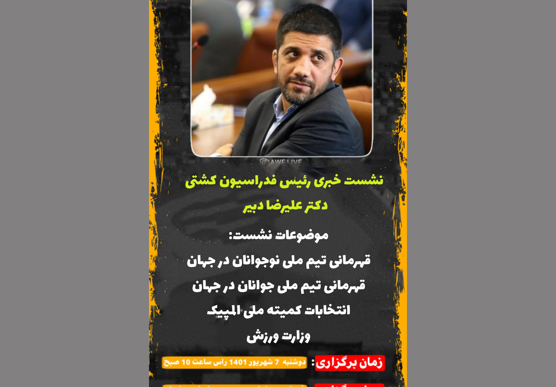 نشست خبری علیرضا دبیر رئیس فدراسیون کشتی با اصحاب رسانه روز دوشنبه 7 شهریورماه در محل فدراسیون کشتی برگزار می شود.