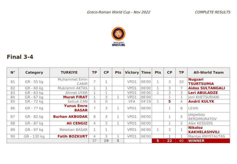 به گزارش روابط عمومی فدراسیون کشتی، دیدار رده بندی جام جهانی کشتی فرنگی 2022 امشب در شهر باکو آذربایجان برگزار شد و در پایان تیم منتخب ستارگان جهان با نتیجه 5 بر 5 و امتیاز مثبت 22 به 19 مقابل تیم ترکیه به پیروزی رسید و عنوان سوم را از آن خود کرد.
