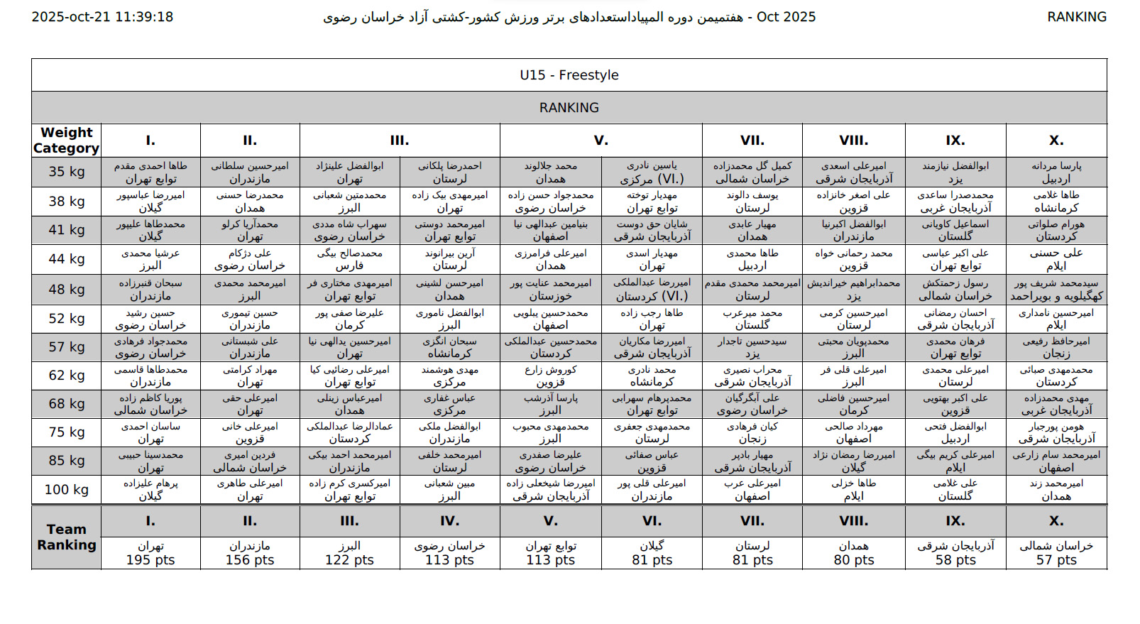 در رده بندی امتیازی تهران با 195 امتیاز اول شد و تیم های مازندران با 156 و البرز با 122 امتیاز دوم و سوم شدند.