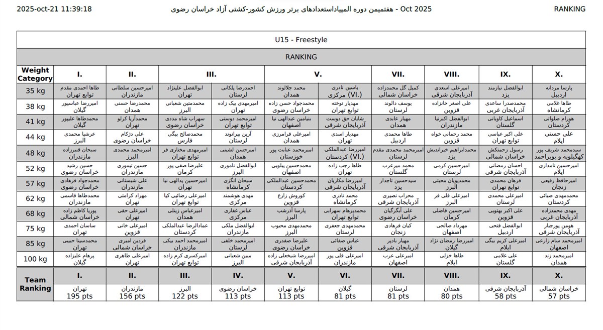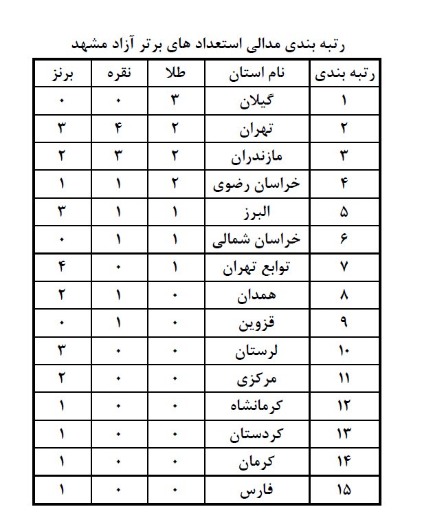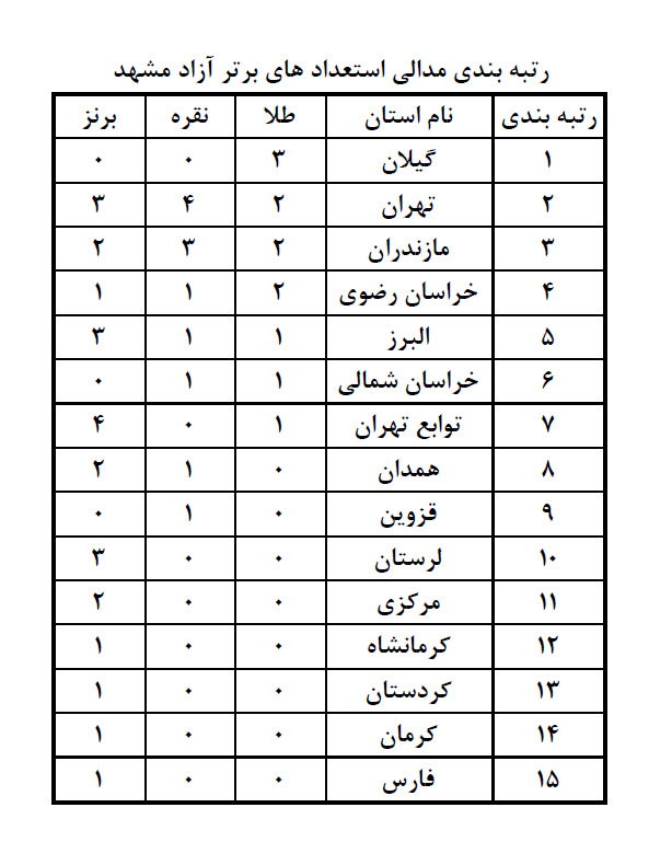 رده بندی مدالی: 1- گیلان 2- تهران 3- مازندران 4- خراسان رضوی 5- البرز 6- خراسان شمالی 7- توابع تهران 8- همدان 9- قزوین 10- لرستان