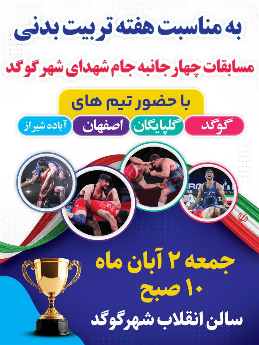 به گزارش روابط عمومی فدراسیون کشتی، این مسابقات به مناسبت هفته تربیت بدنی و ورزش  و با نام مسابقات چهارجانه جام شهدا با حضور تیم هایی از آباده شیراز، اصفهان، گلپایگان و گوگد روز جمعه ۲ آبان ماه برگزار شد.