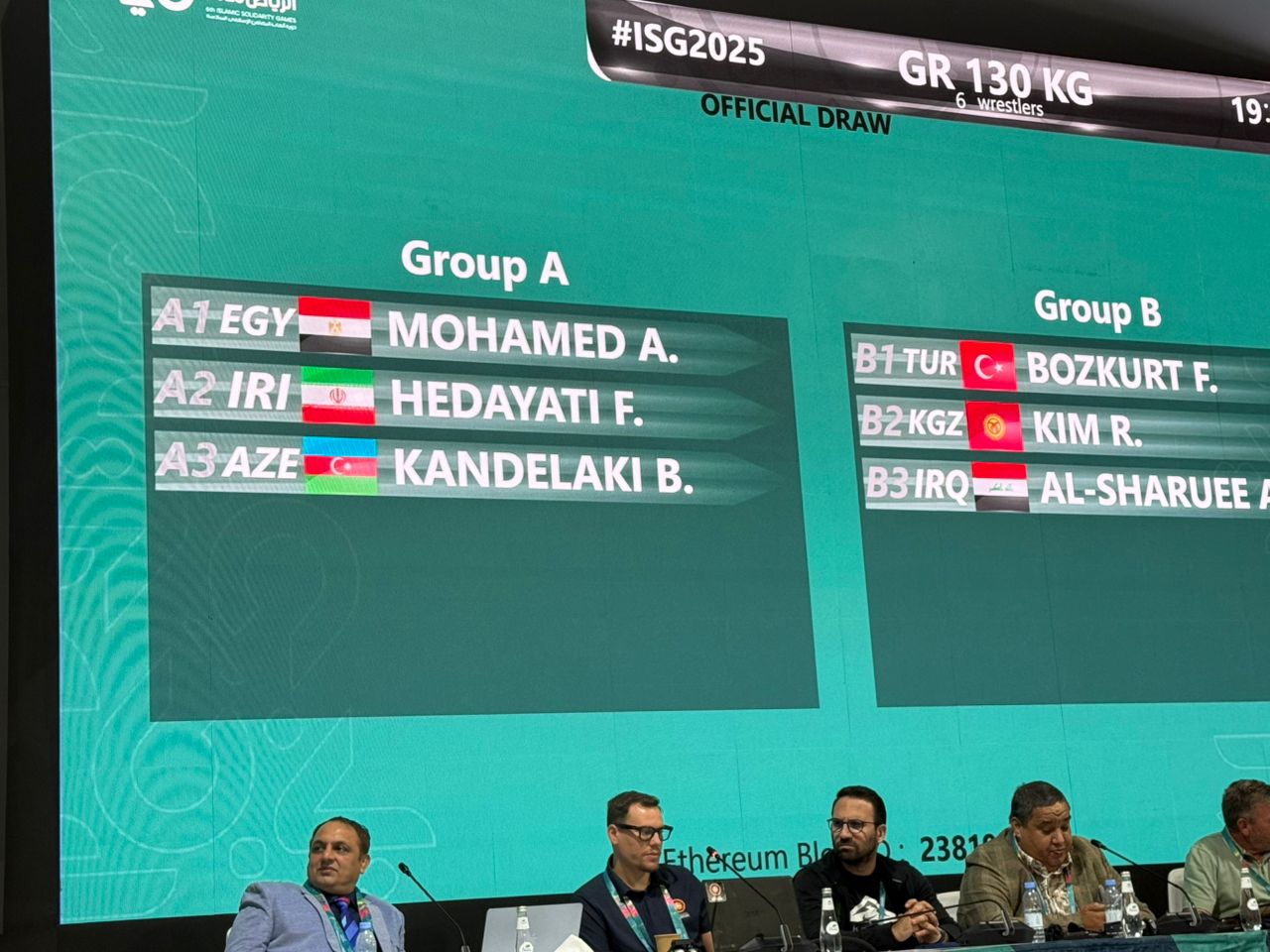 در وزن 130 کیلوگرم که 6 کشتی گیر حضور دارند، مسابقات به صورت دوره ای و در دو گروه 3 نفره برگزار می شود و  فردین هدایتی با محمد از مصر و کاندلاکی از آذربایجان مصاف می دهد.