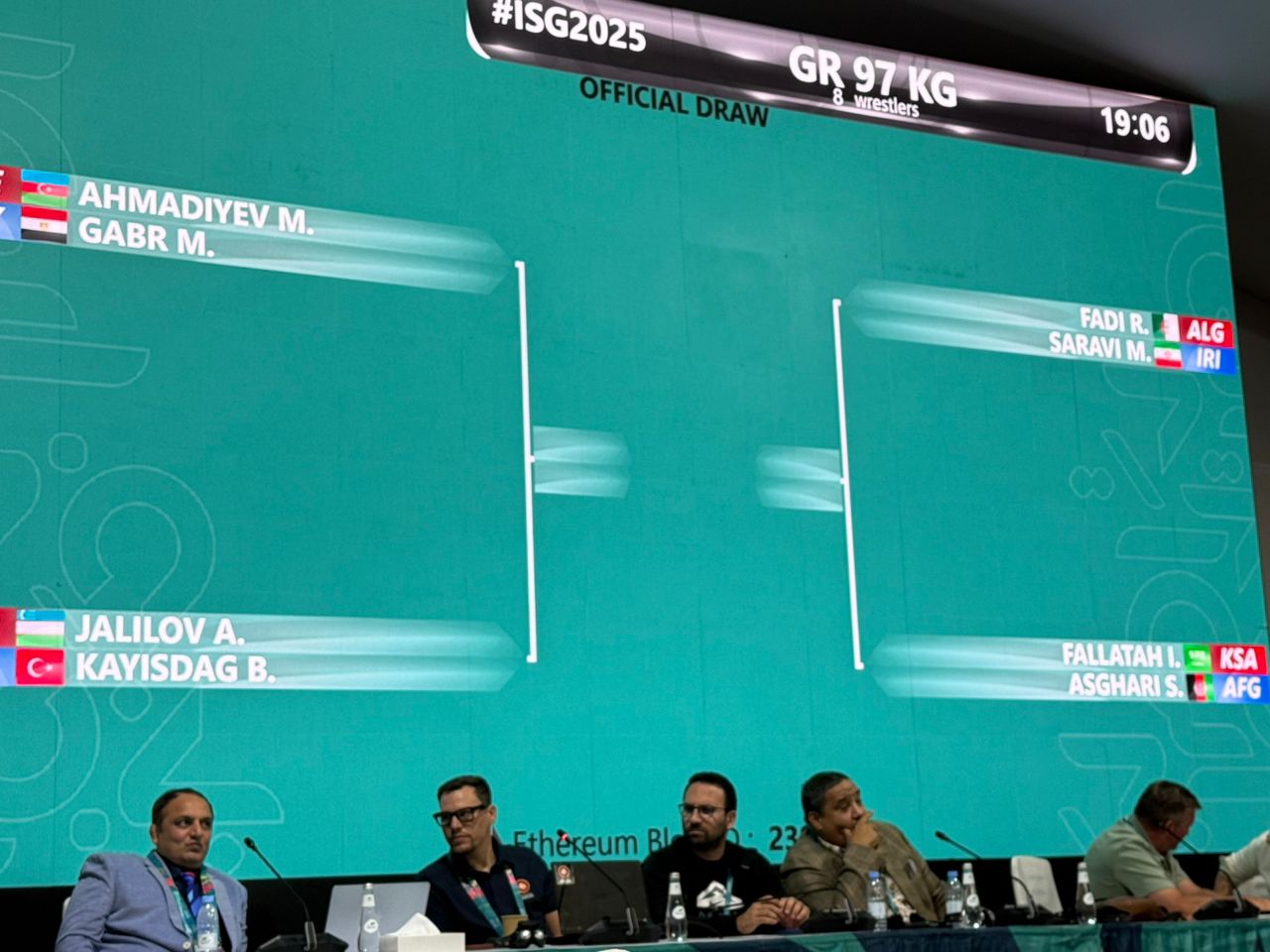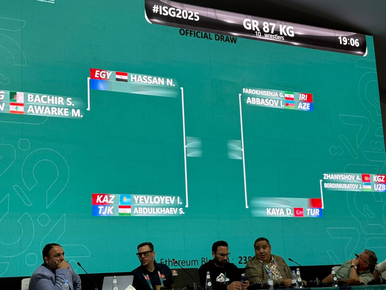 در وزن 87 کیلوگرم که 10 نفر حضور دارند، غلامرضا فرخی در دور اول به مصاف اسلام عباس اف از آذربایجان می رود.
