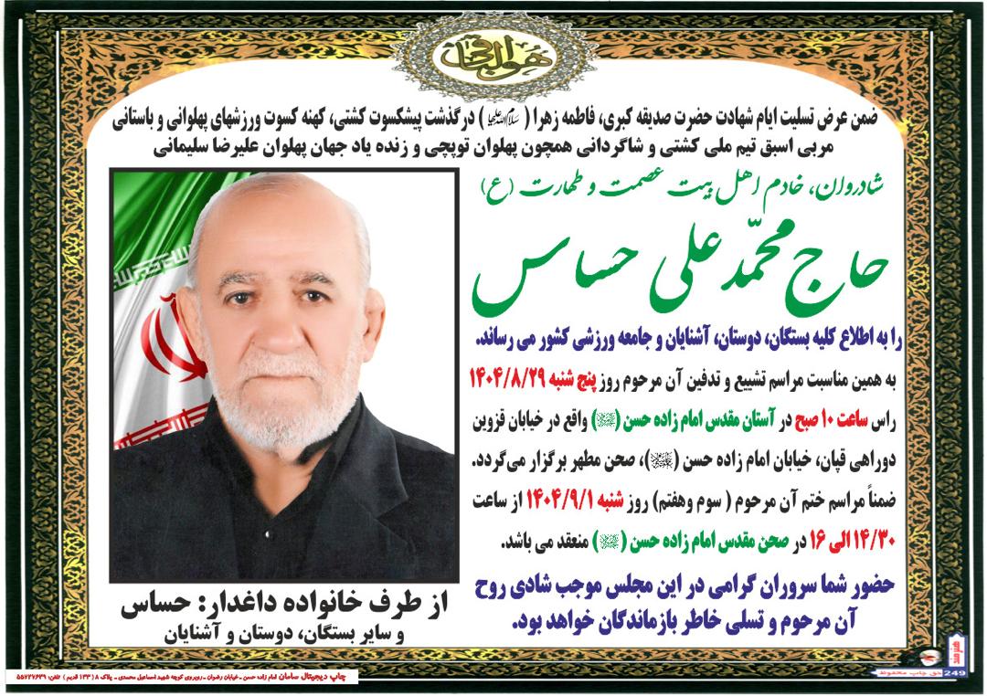 محمدعلی حساس، مربی اسبق تیم ملی کشتی آزاد و مربی زنده یاد علیرضا سلیمانی قهرمان سنگین وزن کشتی آزاد جهان و پهلوان کشور و مربی قهرمانان و کشتی گیران بزرگ ایران، دار فانی را وداع گفت.