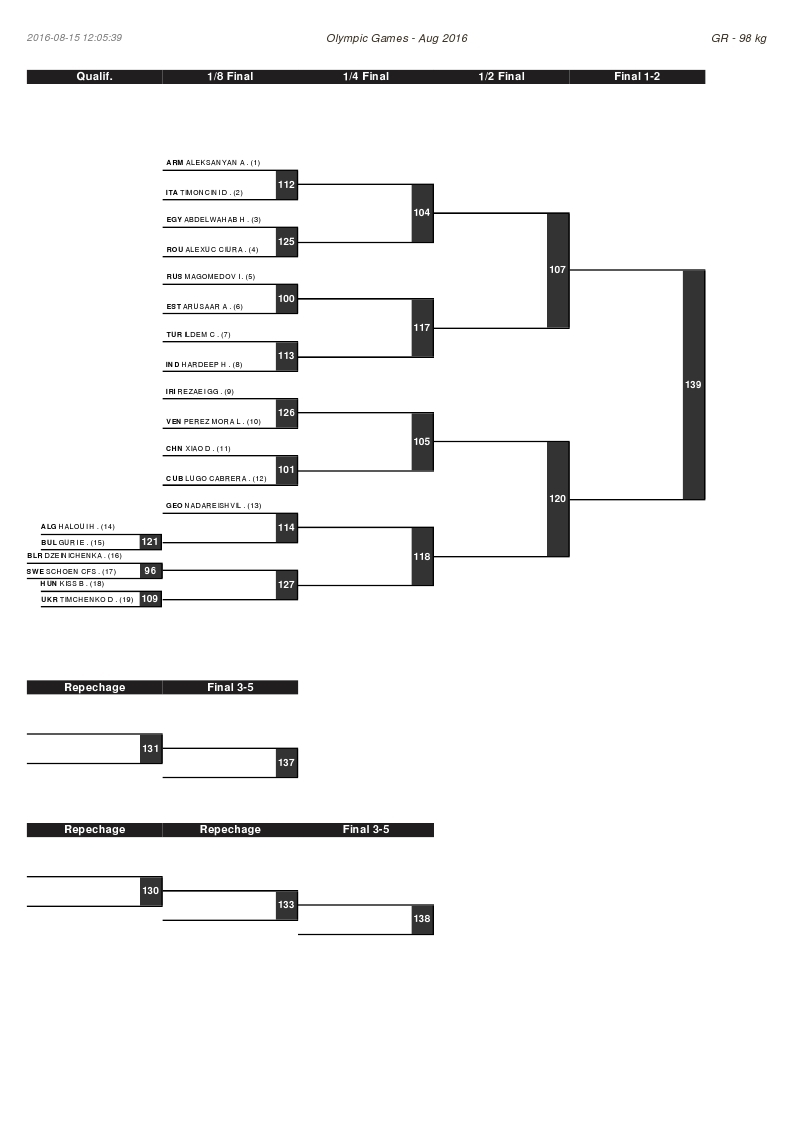 در وزن 98 کیلوگرم که 19 کشتی گیر حضور دارند، قاسم رضایی بعنوان سرگروه جدول دوم، در دور اول با قرعه استراحت مواجه است وی در دور دوم به مصاف لوییس پرز مورا از ونزوئلا می رود و در صورت پیروزی بر این کشتی گیر در دور سوم با برنده ژیائو دی از چین و دانیل یاسمانی از کوبا مبارزه می کند. در گروه رضایی، الیس گوری دارنده مدال جهانی سال 2011 از بلغارستان، بالاژ کیس دارنده مدال طلا و برنز جهان از مجارستان، دیمیتری تیموچنکو دارنده مدال برنز جهان از اوکراین و تسیمافی دزیچنکا از بلاروس حضور دارند. آرتور الکسانیان قهرمان دو دوره جهان از ارمنستان، اسلام ماگمدوف دارنده مدال برنز جهان از روسیه و جنگ ایلدیم دارنده دو مدال برنز جهان از ترکیه نیز در بالای جدول قرار دارند.